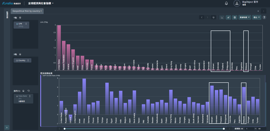 近年來「地緣政治風險」成為企業決策的首位考量因素,透過Aralia全球經濟與社會指標星球,綜合地緣政治風險與各成經濟成長率數據的分析,我們發現:亞洲國家(例如新加坡、馬來西亞、泰國),兼具相對低風險與不錯的市場成長潛力。