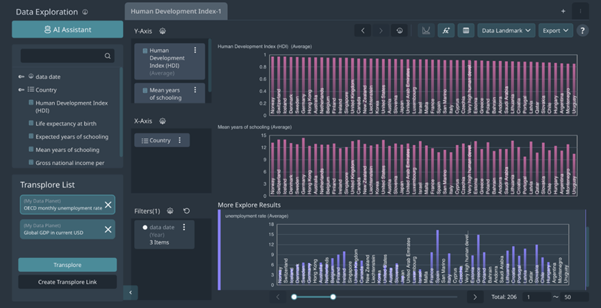 | 全球經濟與社會指標星球 | Global GDP in current USD OECD monthly unemployment rate Geopolitical Risk by country Ease of Doing Business Scores Human Development Index |
