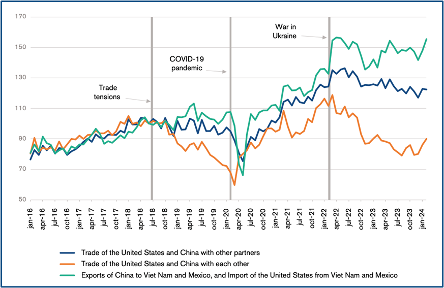 自2018年中美之間關係緊張後,兩國之間的貿易量便呈現明顯下滑走勢。此消彼長,與之相反的是兩國與越南、墨西哥及其他國家的貿易量顯著提升。特別是在2022年俄烏戰爭開打後,加速該趨勢的發展,強烈反映出供應鏈的重新分配。