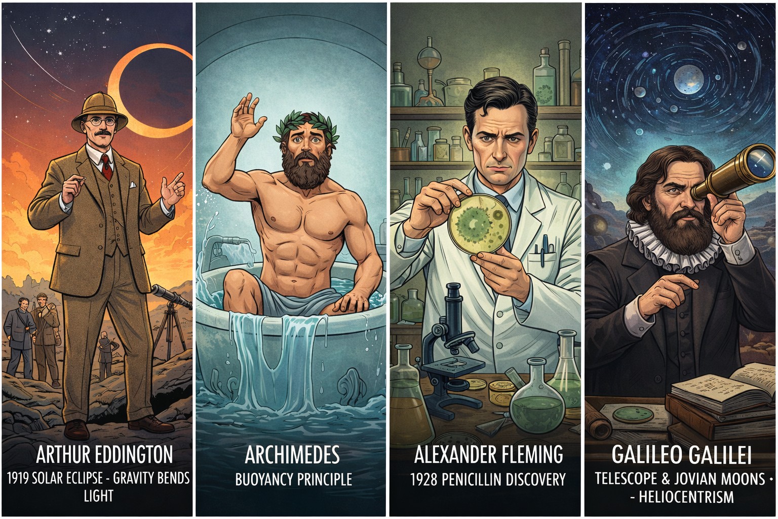 • 亞瑟·愛丁頓: 1919年透過觀察日全食時星星的位置,證實了愛因斯坦的相對論。
