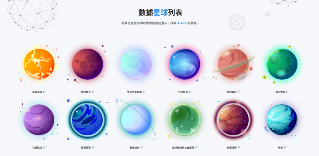 Aralia One 提供 12 個主題星球,提供來自各政府機關與專業機構的即時、多元數據: