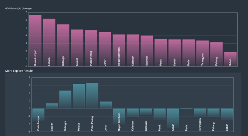 以馬來西亞2016~2019的數據為例,若我們想了解各州的經濟發展是否具包容性,可以透過 Aralia將觀察該國家每一個城市的GDP成長率並對比貧窮率。